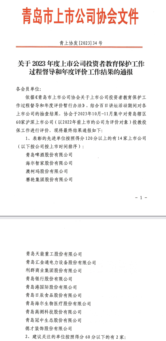 近日,青岛证监局(省级监管机构)联合青岛市地方金融监管局召开青岛辖区第十四届“投资者教育和保护百日讲坛”总结大会。青岛证监局、青岛市上市公司协会从投保工作质效、投资者沟通交流等多个维度逐项客观评分,半岛(中国)重工凭借在“百日讲坛”活动中的突出表现及投关工作优秀实践,最终在青岛辖区参评的60余家上市公司中名列前茅,获得“2023年度青岛投资者保护工作先进单位”称号,体现了监管部门和行业协会对半岛(中国)重工投保投教工作的充分认可与肯定。