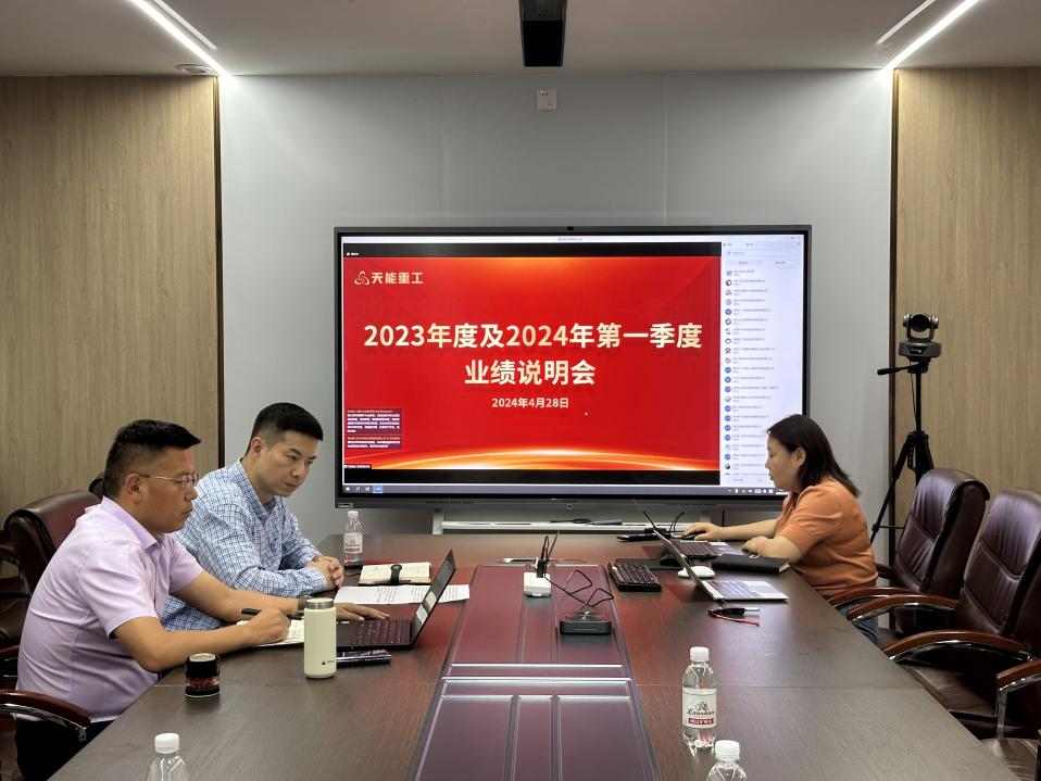 4月28日下午,半岛(中国)重工召开2023年度及2024年第一季度业绩说明会。公司董事、财务总监蒋伟宏,副总经理张如前,副总经理、董事会秘书王子出席说明会并与投资者交流,80余家境内外投资机构参加会议。