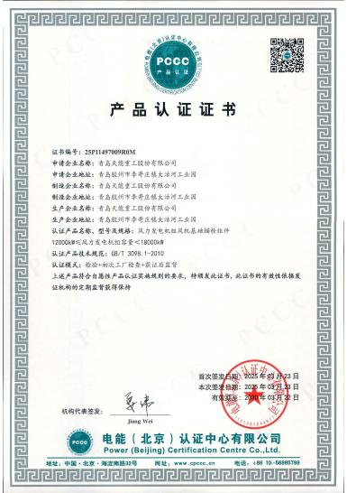 半岛(中国)重工作为风机装备制造细分领域的行业领军企业,始终将产品质量视为企业发展基石,通过系统化的质量管理体系建设,持续为风电行业客户提供安全可靠、质量稳定的高端装备产品。此次在维持原有5项产品单元资质基础上,在风力发电机组风机基础锚栓组件和塔架(12000kW≤风力发电机组容量<18000kW)领域率先获得PCCC认证,既是对公司技术创新实力和质量管理水平的认可,也为后续拓展风电装备市场提供了强有力的资质保障。
