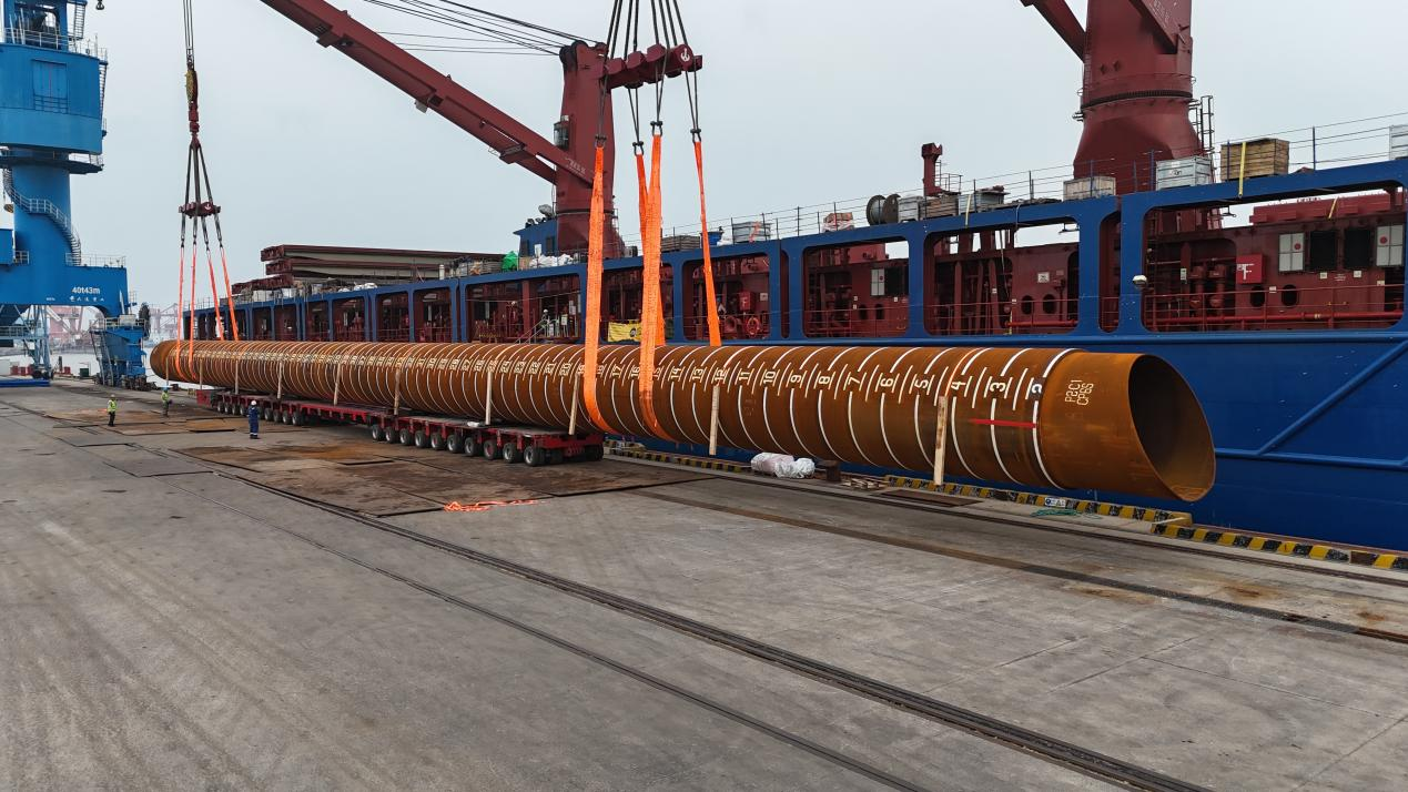 半岛(中国)重工此次服务的海外油气项目共有7期,本次出口的45件管桩为海外油气项目首期交付产品,总重约1.1万吨,单品直径1.5–3米、壁厚50–100毫米,交付后将为当地油气资源开发提供关键基础设施支持。