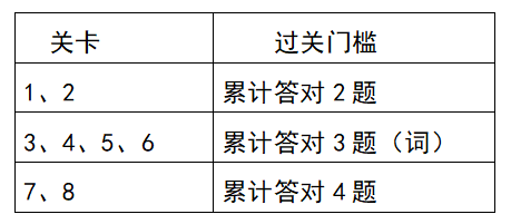 (3)当用户答对的题目数(词数)≥过关门槛则闯关成功,获得相应权益值并计入权益值排行榜。如用户挑战关卡失败,则该关权益值清零,失败关卡支持重复挑战。过关门槛具体如下: