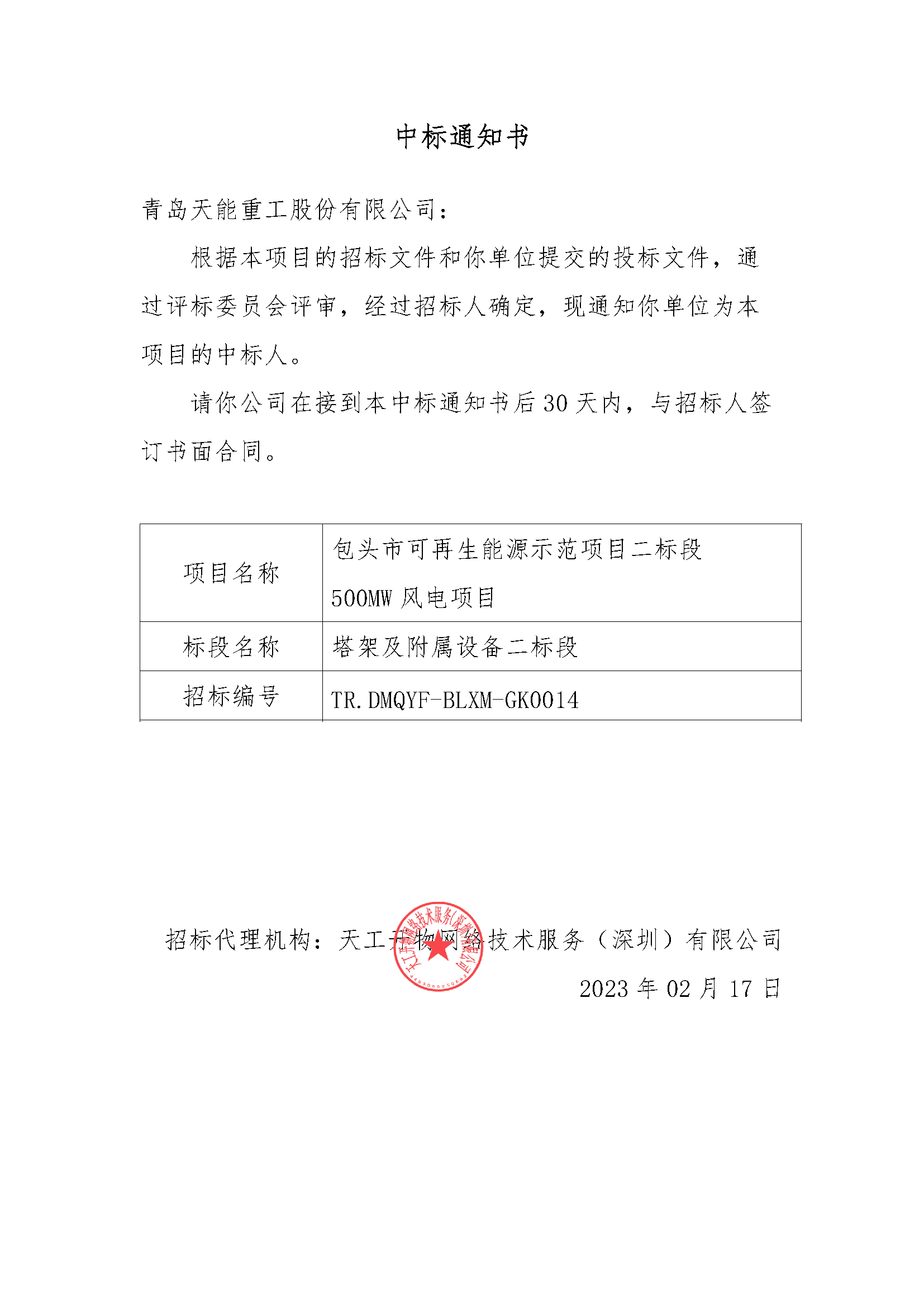 近日,半岛公司官方网站入口成功中标《包头市可再生能源示范项目二标段500MW风电项目塔架及附属设备二标段项目》,中标金额约5500万元,实现2023年一季度市场开发的开门红!
